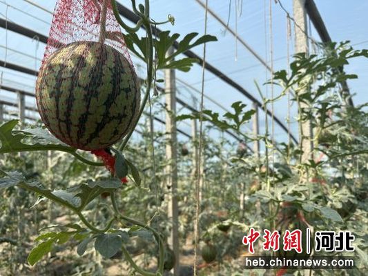 中新网河北新闻6月9日电 (孟佳 徐鹏远)近日,在秦皇岛市卢龙县木井镇邸柏各庄村一家果蔬专业合作社的大棚内,农民将新品种西瓜种出了新意,采用吊蔓立体种植技术,让西瓜“住”进了网兜。