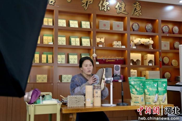 图为工作人员在直播推广艾产品。 郭江鹏 摄