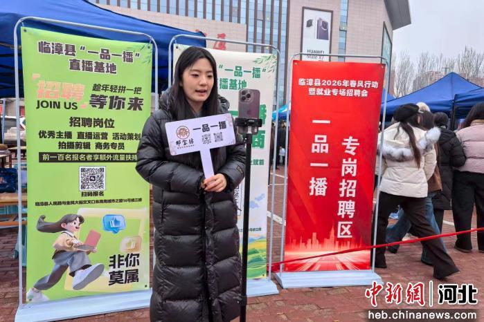 图为招聘会现场,临漳县“一品一播”专班工作人员在进行专岗招聘直播。刘云 摄
