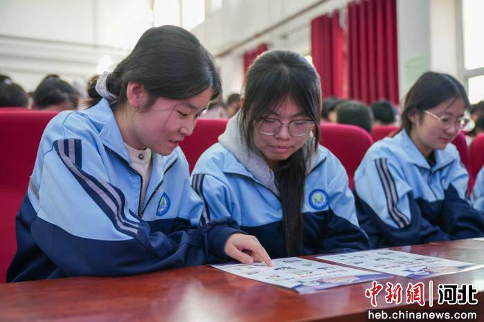 图为任丘市第二中学开展普法课堂,学生正在阅读防诈反诈宣传页。 李滨 摄