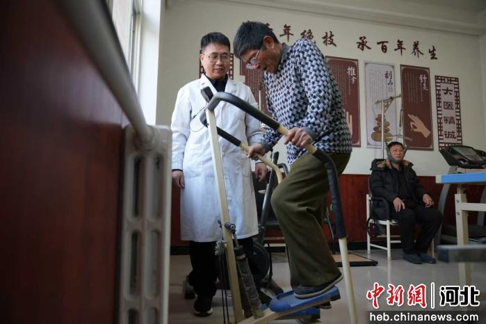 图为任丘市议论堡镇卫生院,医务人员辅助居民做康复运动。 韩慧峰 摄