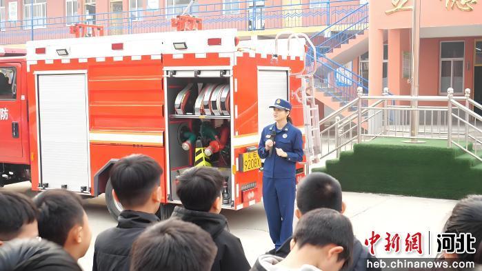 图为宁晋县消防救援大队消防宣传员正在给学生讲解消防安全知识。 李志强 摄
