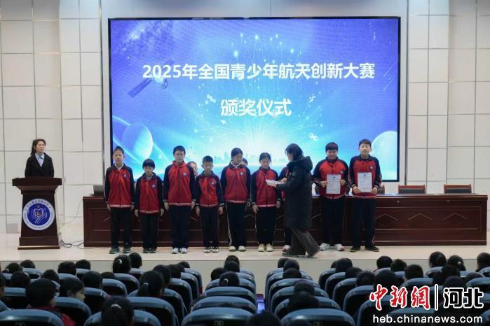 中新网河北新闻12月24日电(陈子康)24日下午,在河北沧州任丘市第九实验小学,工作人员正在为获得“全国航天创新大赛”奖项的学生颁奖。