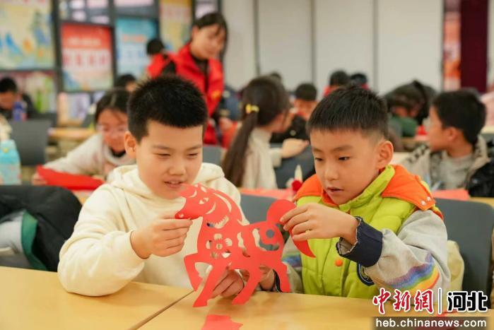 图为孩子们正在返乡大学生的指导下剪马年主题窗花。 王倩倩 摄