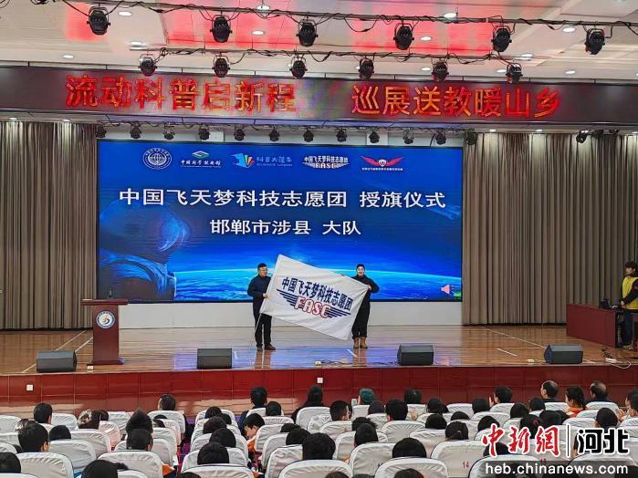 图为中国飞天梦科技志愿团向邯郸市涉县大队授旗。 付晓东 摄