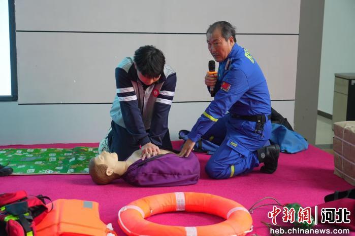 图为鸡泽县蓝天应急救援队队员正在指导学生进行心肺复苏实操。 王佳琪 摄