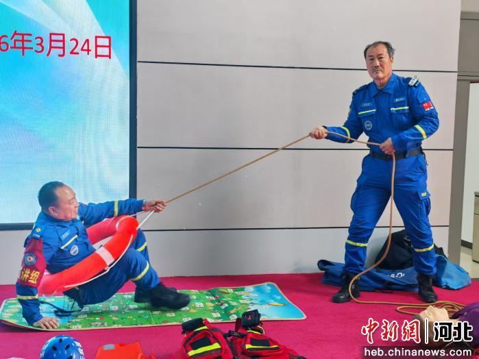 图为鸡泽县蓝天应急救援队队员正在演示溺水人员救助方法。 苑卉鑫 摄