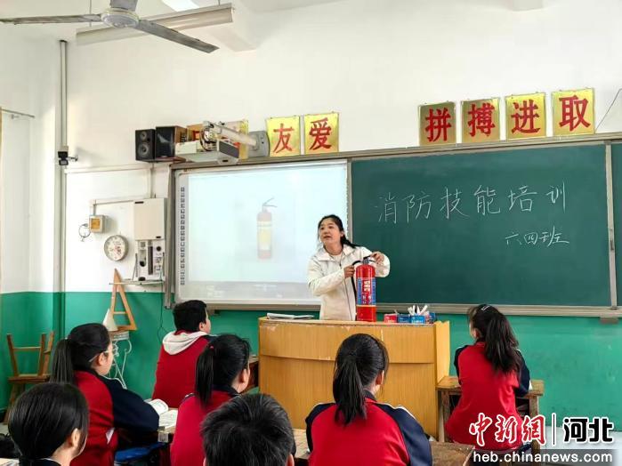 图为泊头市新华小学教师讲解灭火器使用方法。 代秋晨 摄