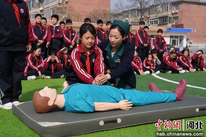 图为任丘市实验小学,工作人员教学生急救知识。 刘禧龙 摄