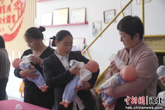 图为任丘市一家政培训基地,讲师正在为学员讲解示范婴幼儿喂奶技巧。 韩慧峰 摄