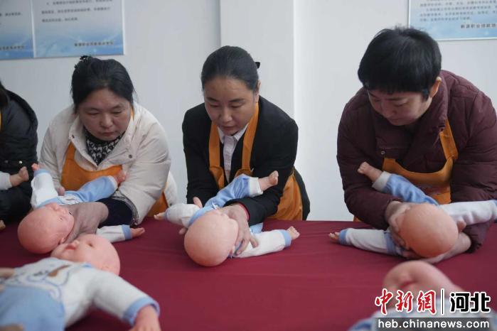 图为任丘市一家政培训基地,学员正在学习婴幼儿护理知识。 韩慧峰 摄