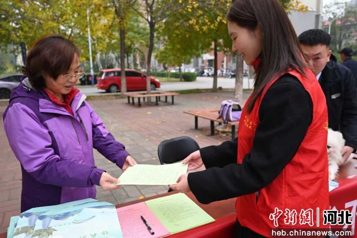 中新网河北新闻10月27日电 (尹航)27日上午,在河北省沧州任丘市会战道街道创业一社区,工作人员为居民讲解文明养宠知识。