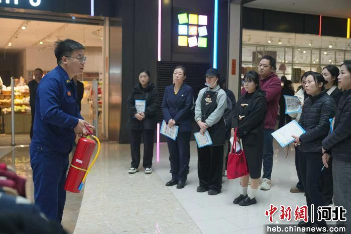图为任丘市一商场,工作人员演示消防器材使用方法。 韩慧峰 摄