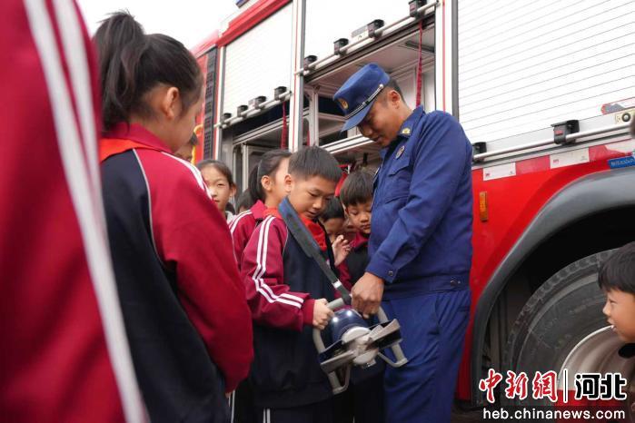 图为任丘市实验小学,工作人员带领学生体验消防器材。 韩慧峰 摄