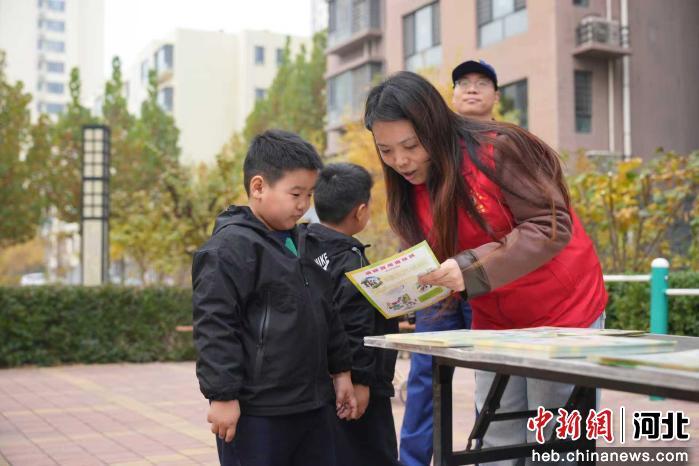 图为任丘市油建路街道丽升社区,工作人员正在发放消防安全宣传单。 韩慧峰 摄