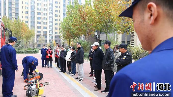 中新网河北新闻11月7日电 (赵宇 王建宏)6日,在河北省沧州市南皮县一小区,消防救援大队的宣传员向小区居民介绍消防救援设备、普及消防安全知识。