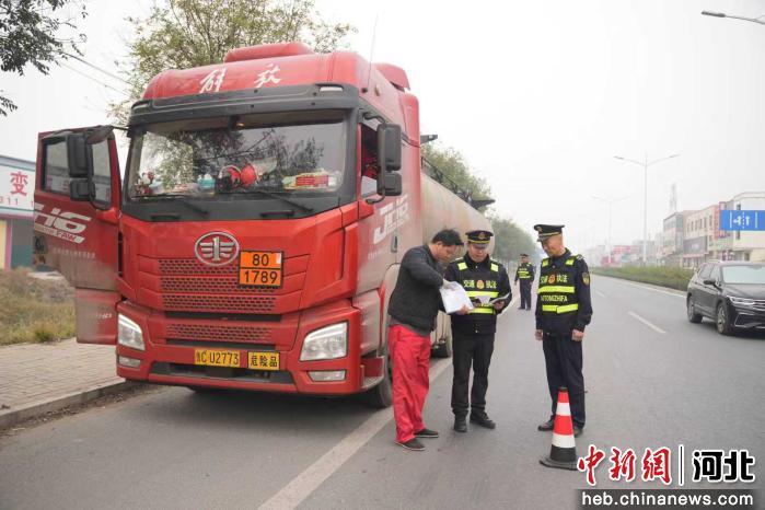 图为任丘市交通运输局工作人员对大型货物运输车辆进行现场勘验。 韩慧峰 摄