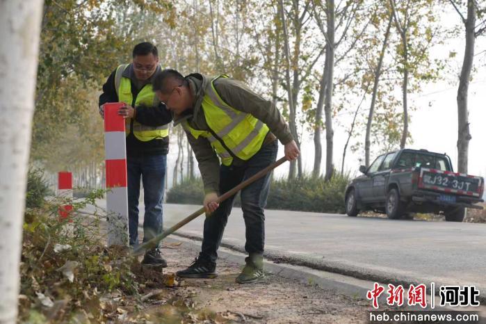 图为任丘市梁召镇县乡公路段,道路养护人员正在进行警示桩填埋。 韩慧峰 摄
