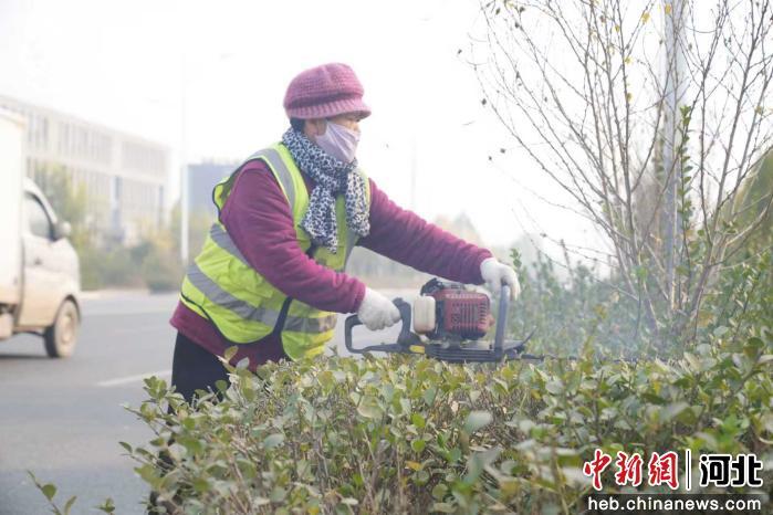 图为道路养护人员对县乡级公路段绿化带进行维护修剪。 韩慧峰 摄