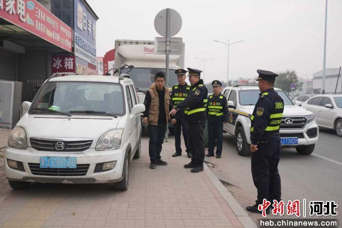 图为任丘市交通运输局工作人员对公路沿线占道车辆进行劝导。 韩慧峰 摄