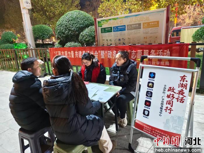 中新网河北新闻11月24日电 (王天译 孙雨蝶 马少岩)21日晚,在河北省邯郸市广平县东湖公园,该县政务服务中心举办首期“东湖夜话 政好同行”政务夜市活动,以“夜间服务”模式将便民服务送到群众“家门口”。