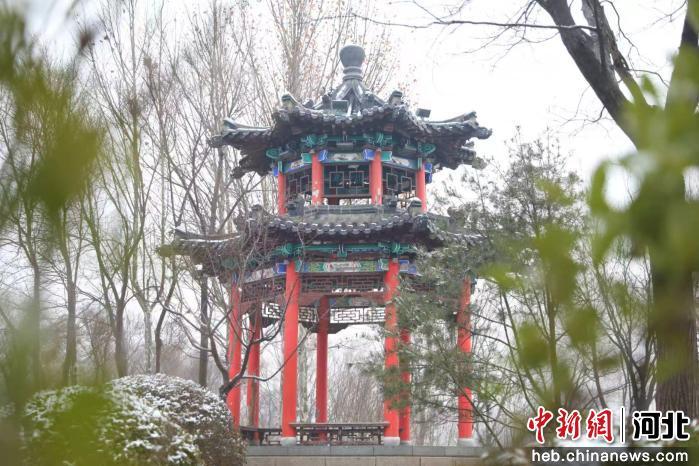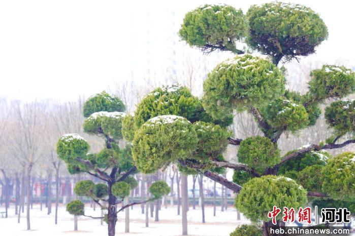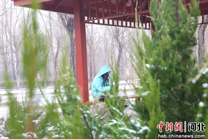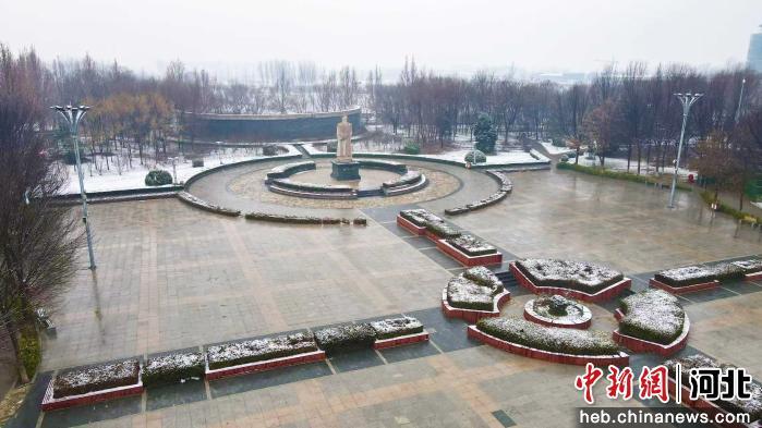 中新网河北新闻12月23日电 (赵华靖 靳东凯)23日,在河北省沧州市南皮县香涛公园,冬雪悄然而至,翠绿的冬青与张之洞雕像相伴,这寒意中的“绿色坚守者”,为公园解锁了冬日新雪景。