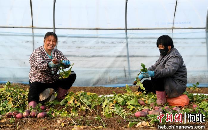 中新网河北新闻1月21日电 (崔志平 苗凤强 崔贤飞)近日,走进河北省衡水市阜城县霞口镇一温室大棚里,一颗颗紫红色的水果萝卜破土而出,村民们正忙着采收萝卜,并进行分拣、装箱。