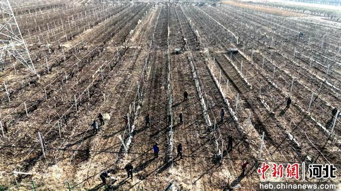 图为航拍梨园冬剪作业现场。 董栋 摄