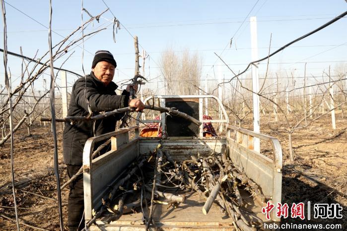 图为村民装运修剪下的梨树枝条。 董栋 摄