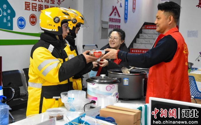 图为外卖小哥到社区吃腊八粥。 许昊 摄