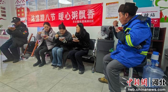 图为居民在社区吃腊八粥。 许昊 摄