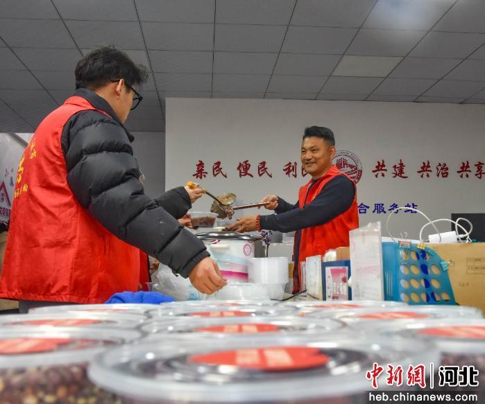 图为社区工作者将腊八粥装进餐盒。 许昊 摄