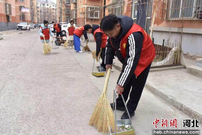 图为大学生志愿者在小区内清理垃圾。 陈虎斌 摄