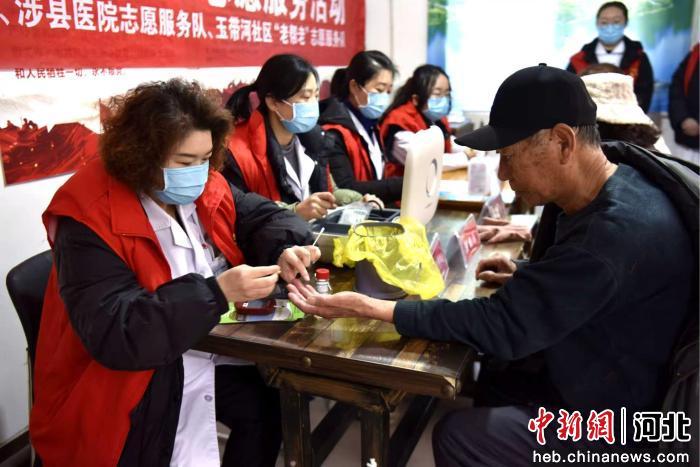 图为医务志愿者在为老人进行血糖检测。 陈虎斌 摄
