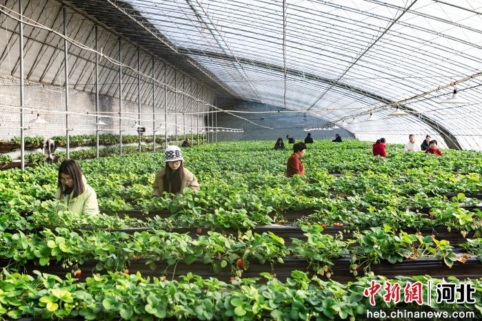 中新网河北新闻2月2日电 (徐巧明 沈齐)2月1日,河北省高阳县邢家南镇辛留佐村一处草莓大棚里暖意融融,游客穿梭垄间,采摘草莓、拍照打卡。