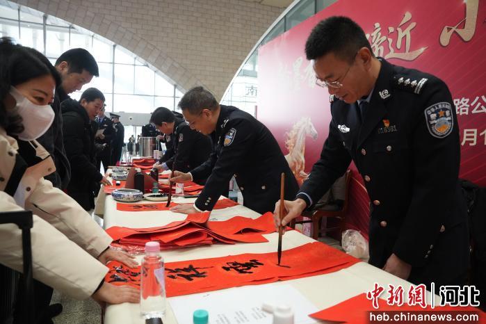 中新网河北新闻2月11日电(郭怡)小年纳福,归途情暖。2月10日,正值北方小年,北京铁路公安局石家庄公安处在石家庄站候车室开展“翰墨香迎春蹄近,小年福暖旅途长”活动,特别组织了多名擅长书法的民警现场书写春联福字赠予旅客,同步开展反诈宣传并发放文创礼品,以文化暖心、安全护航的方式,将新春祝福与平安守护一同送到旅客身边。