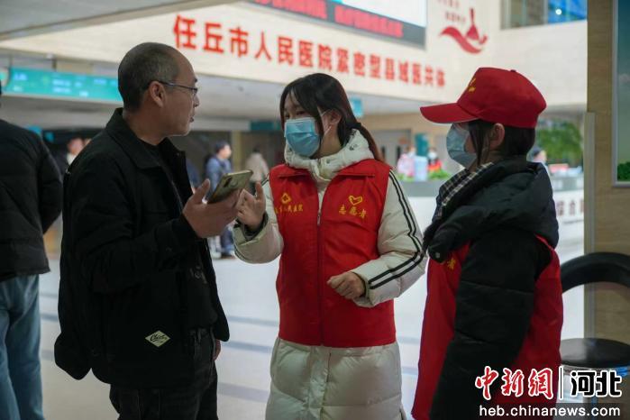 图为任丘市人民医院,大学生志愿者为就诊人员讲解网上挂号流程。 韩慧峰 摄