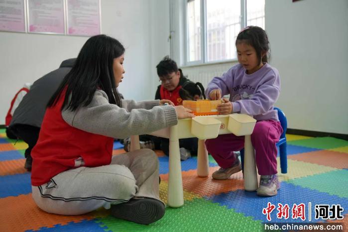 图为任丘市新华路街道万丰社区,大学生志愿者陪伴托管儿童进行游戏。 韩慧峰 摄