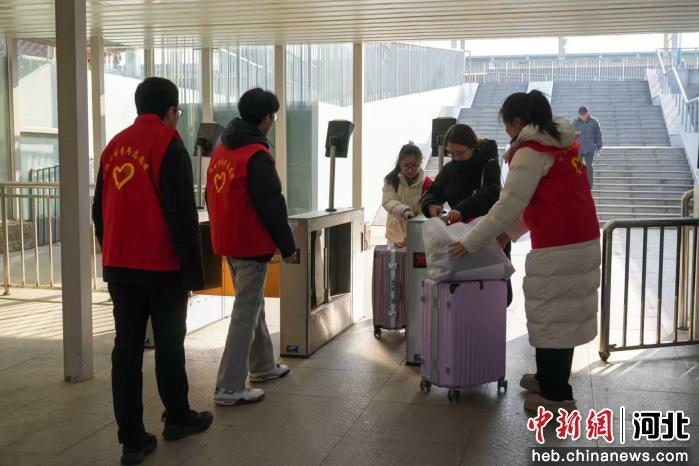 图为任丘市火车站,大学生志愿者帮助乘客拉行李。 韩慧峰 摄