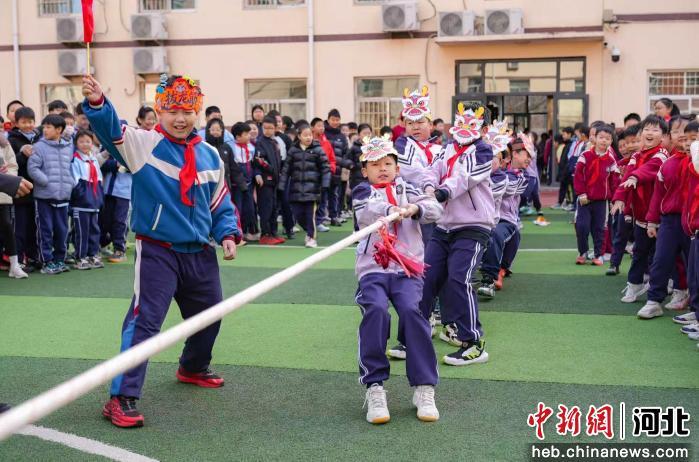 图为小朋友正在进行“拔龙筋”趣味比赛。 王倩倩 摄