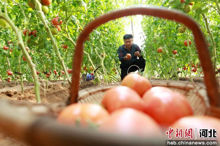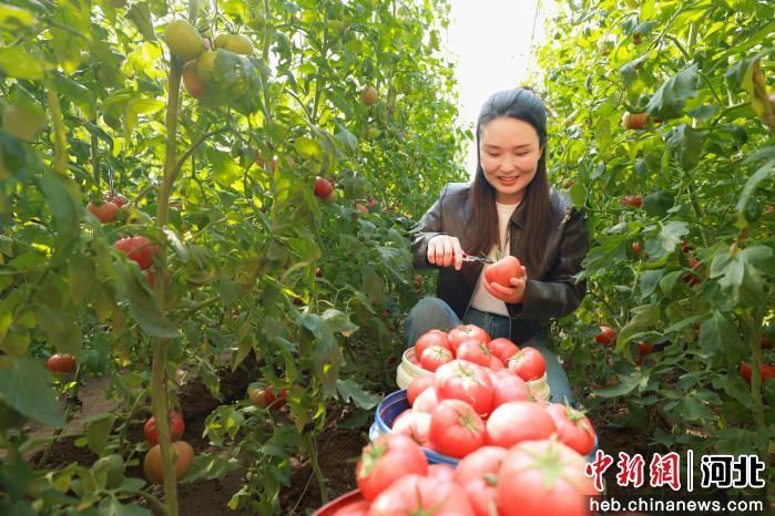 图为内丘县官庄村海辰果蔬种植基地的农户在采摘西红柿。 刘继东 摄