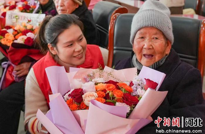 图为志愿者向老年人送上鲜花与祝福。 王倩倩 摄