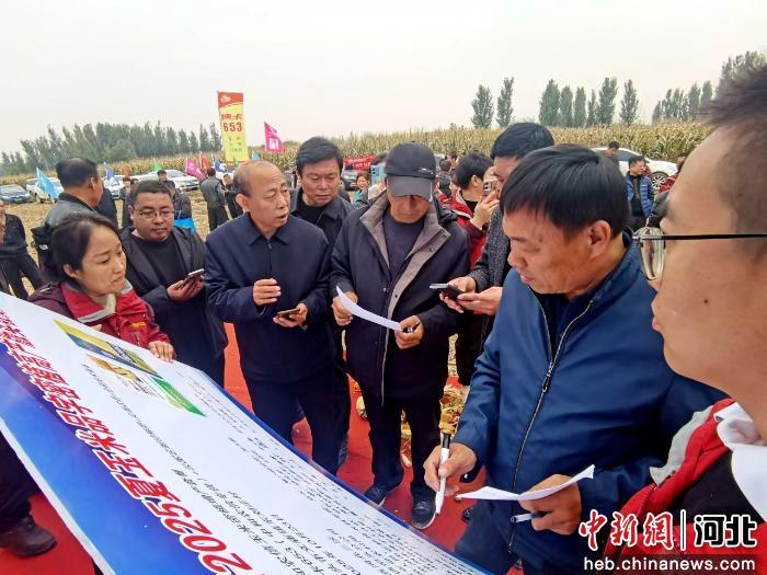 中新网河北新闻10月23日电(王琳)23日,河北省沧州泊头市在文庙镇举办玉米宽窄行高密度种植技术现场观摩会,农技人员与种植户共同进行田间测产,评估该技术的实际应用效果。