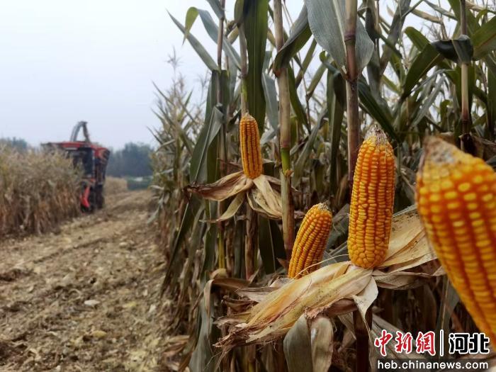 图为收割机穿梭在基地里收割玉米。 田志锋 摄