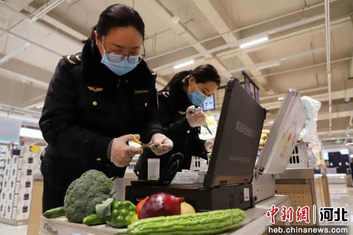 图为孟村市场监督管理局工作人员深入辖区商超进行食品快检。 杨洋 摄