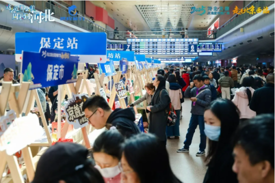 北京西站活动现场,二层的候车室通道化身成充满燕赵风情的文旅站台,精心布置的展区成为旅客们关注的焦点。活动巧借北京西站巨大客流,将河北文旅资源直接送达旅客身边。