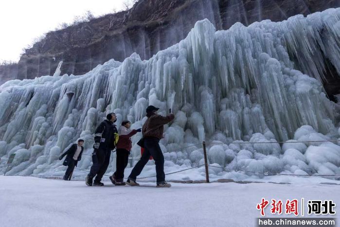 图为武安市东太行百里画廊七步沟景区里的游客在冰瀑前打卡。 李树锋 摄