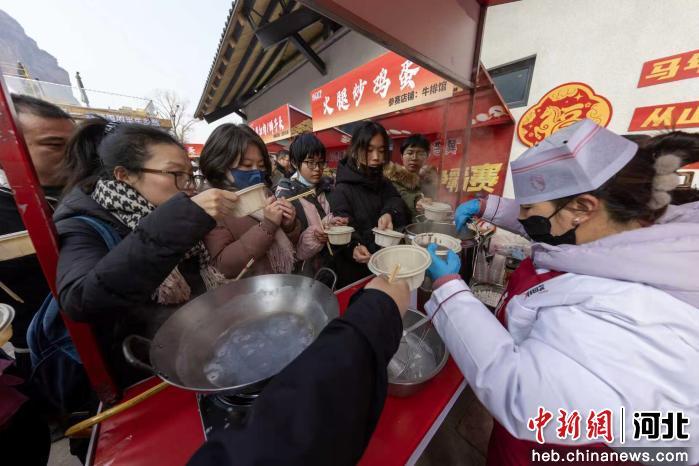 图为武安市东太行百里画廊山李冀·李家庄山游市集里的游客争相品尝地方美食。 李树锋 摄