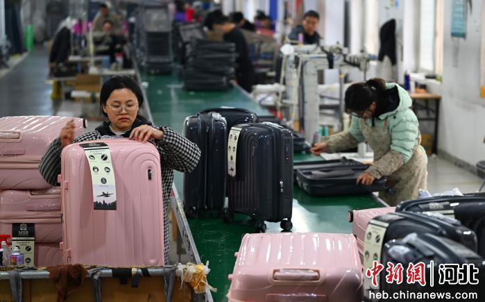 中新网河北新闻3月2日电 (徐巧明 冯云)2月28日,走进河北省保定市白沟新城某箱包皮具有限公司车间看到,各环节流水线高效运转,工人们熟练操作着设备,赶制箱包订单。