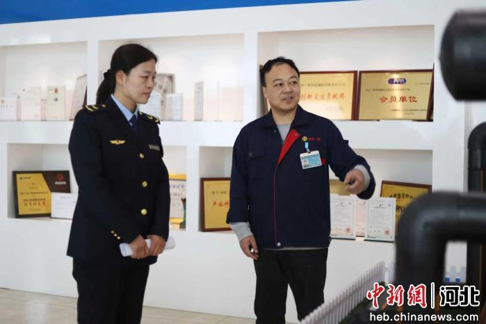 图为孟村市场监督管理局工作人员入企业指导知识产权与专利产品研发事项。 杨洋 摄